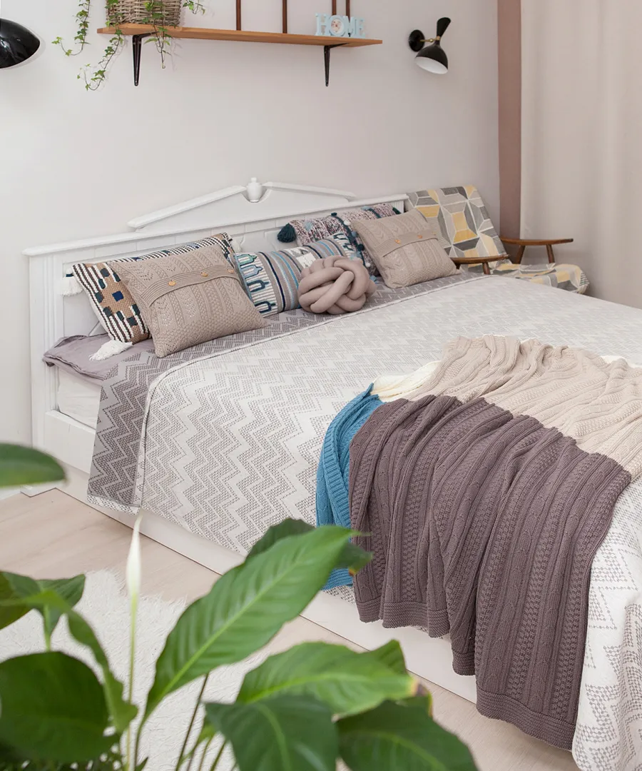 1. совсем не использовать покрывало, а набросить на кровать хлопковый плед и небрежно отвернуть наружу один из его краев в области подушек.