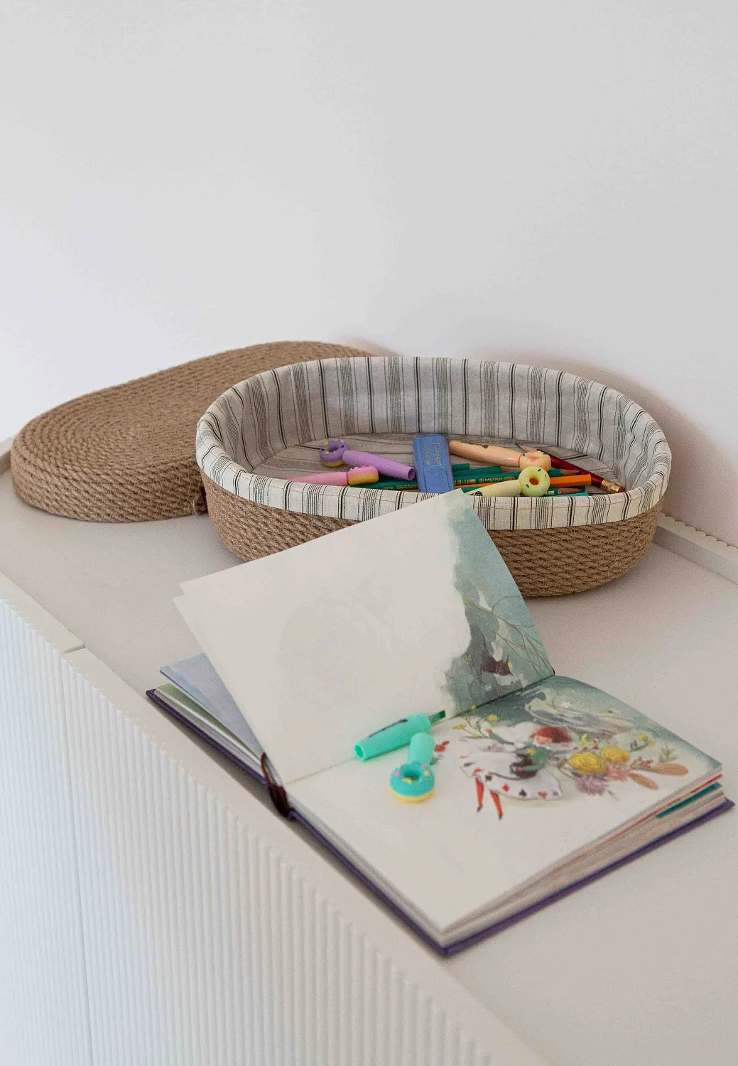 Декоративная корзиночка ЮТА с крышкой, с льняным съемным чехлом изготовлена из натурального джута, пришивной лэйбл LUXBERRY из искусственной кожи, съемный чехол изо льна в полосочку.Размер корзинки с крышкой : 32х20х7,5см.