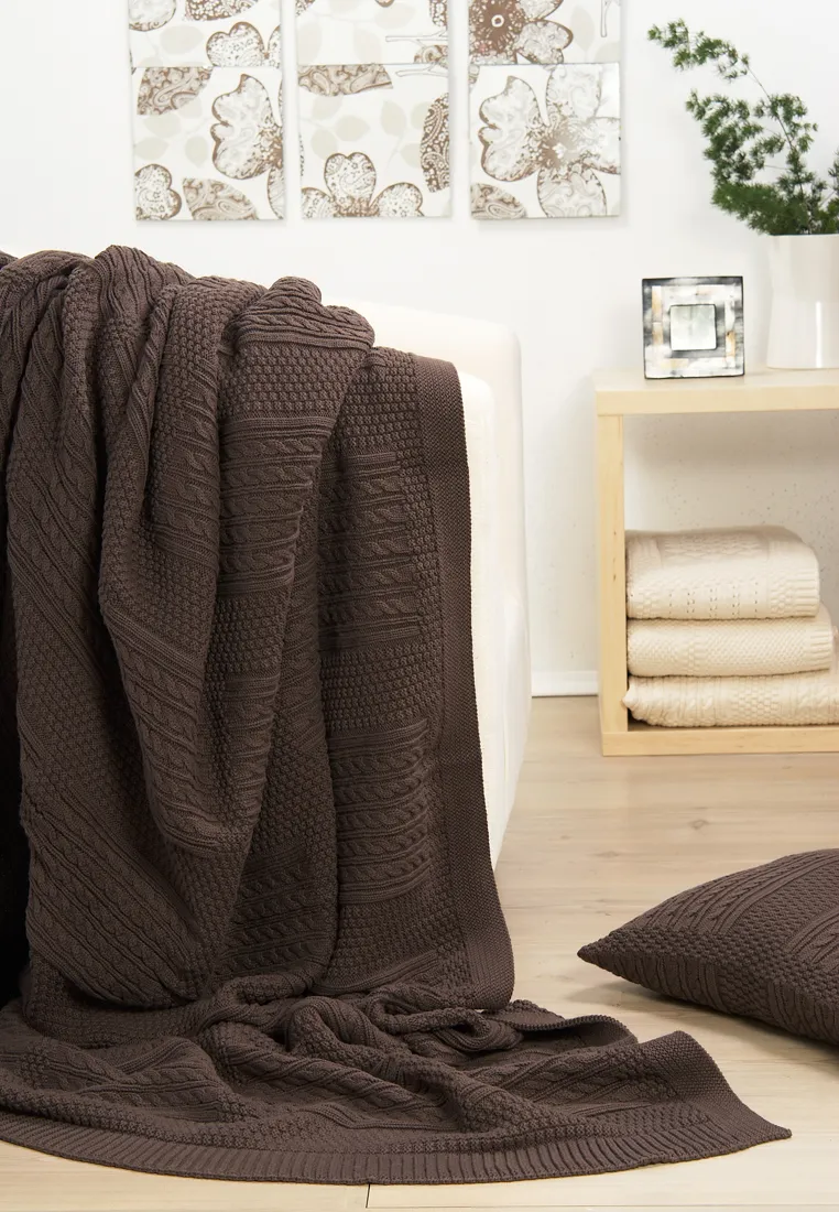 Чудесный плед Imperio 3 - это 100% хлопок,итальянская пряжа, без добавления синтетики.Имеет интересный дизайн- квадратный рапорт из пяти рядов косичек,а вокруг рельефные шашечки,хорошая плотная резинка.Плед Imperio 3 мы относим к покрывальным пледам,так как его можно использовать вместо покрывала на кровать или диван или с покрывалом в качестве элегантного фактурного и цветового акцента.В этом случае он выступает как декоративный элемент в Вашем интерьере.Не бойтесь-плед не пилингуется,стирается в машинке в специальной сетке для нежной стирки.Вообщем,относитесь к нему как к любимому хлопковому свитеру! В коллекции есть несколько классных цветов: коричневый,оливковый. К пледу отдельно можно приобрести декоративную наволочку 40х40 см с деревянными пуговицами.Не забудьте о подушке Люксбери!