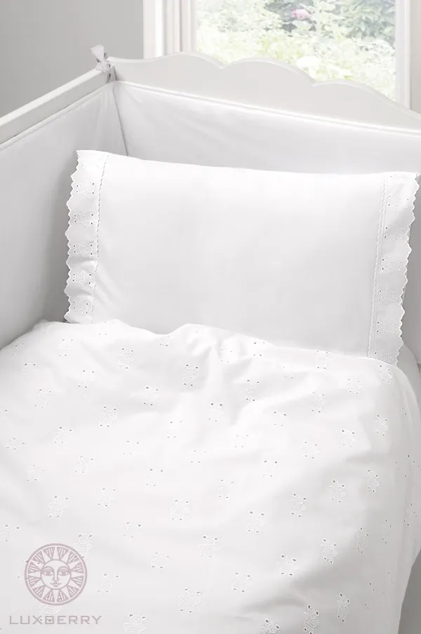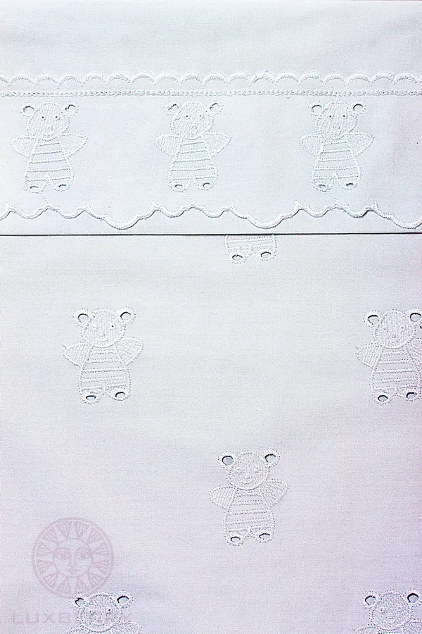 Основной цвет комплекта постельного белья "МИШУТКИ" - белый. Внешнее поле пододеяльника заполнена вышивкой "мишутки" с элементами "прорезной глади" на ушках и лапках медвежонка. Наволочка с двух сторон украшена тесьмой с вышивкой.