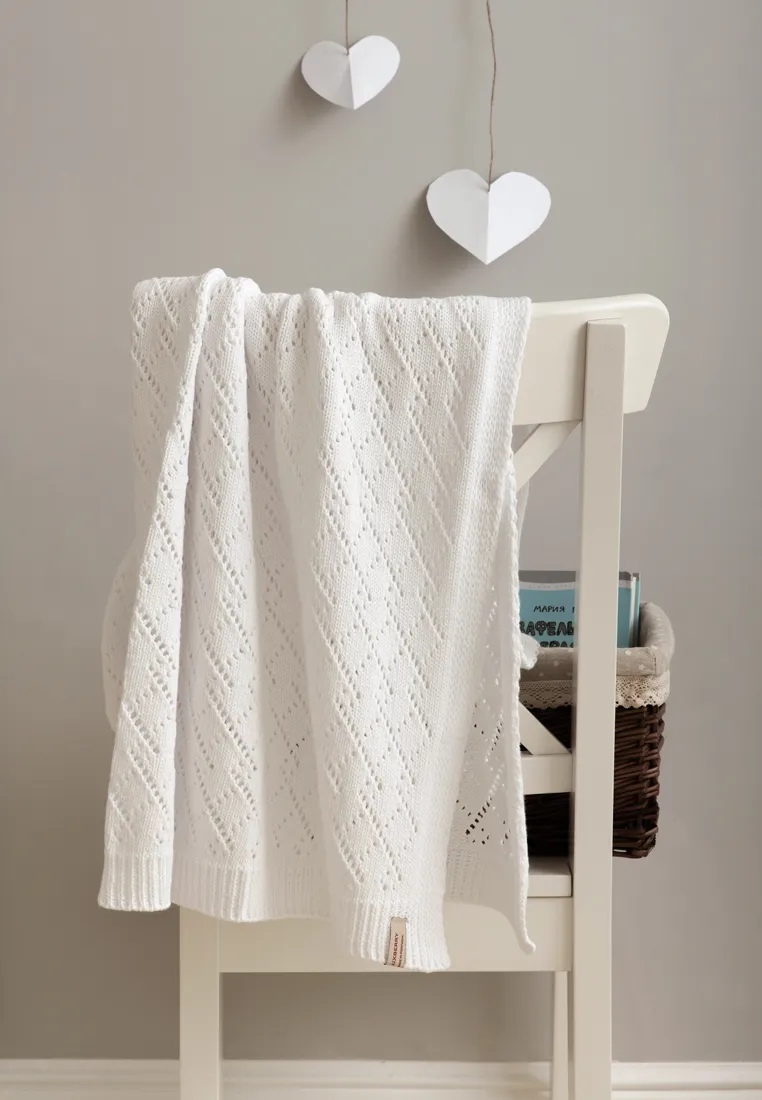 Детский плед IMPERIO172 вывязан из 100% высококачественных хлопковых нитей.Рисунок пледа - ажурный, изящный: пересечение ромбов создает ощущение легкости и нежности. Не смотря на дырочки в полотне, плед IMPERIO172 хорошо удерживает тепло и регулирует температурный режим во время сна. Плед красивый и может использоваться и как декоративный элемент в интерьере детской комнаты.
