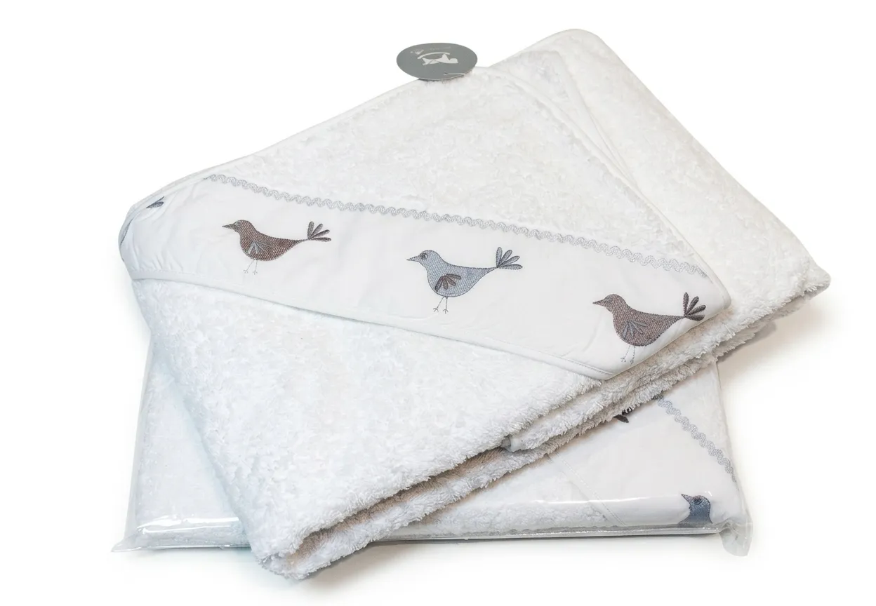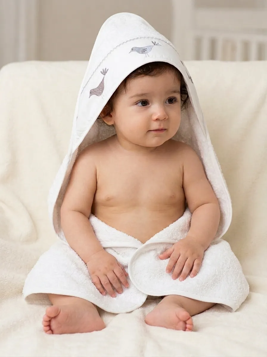 Детское полотенце с капюшоном «Птички» от португальского бренда TM Bovi — это мягкий и безопасный текстиль для ухода за малышом после купания. Изделие выполнено из 100% хлопка (махра) плотностью 550 г/м², что обеспечивает высокую впитываемость, нежность к коже и долговечность.Полотенце размером 100×100 см удобно использовать для новорождённых и детей младшего возраста. Капюшон защищает голову ребёнка от переохлаждения, а натуральный хлопок не вызывает раздражения даже на чувствительной коже.