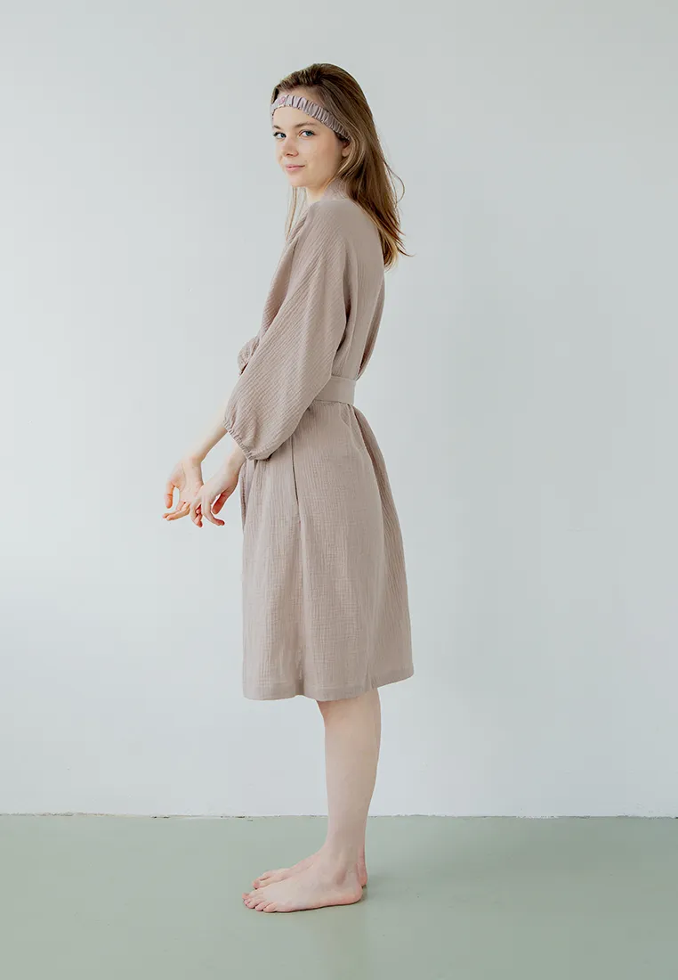 Купить халат из муслина вы можете в цветах: графитовый, экрю, тауп, пыльно- бирюзовый и в трех размерах: S, M и L.