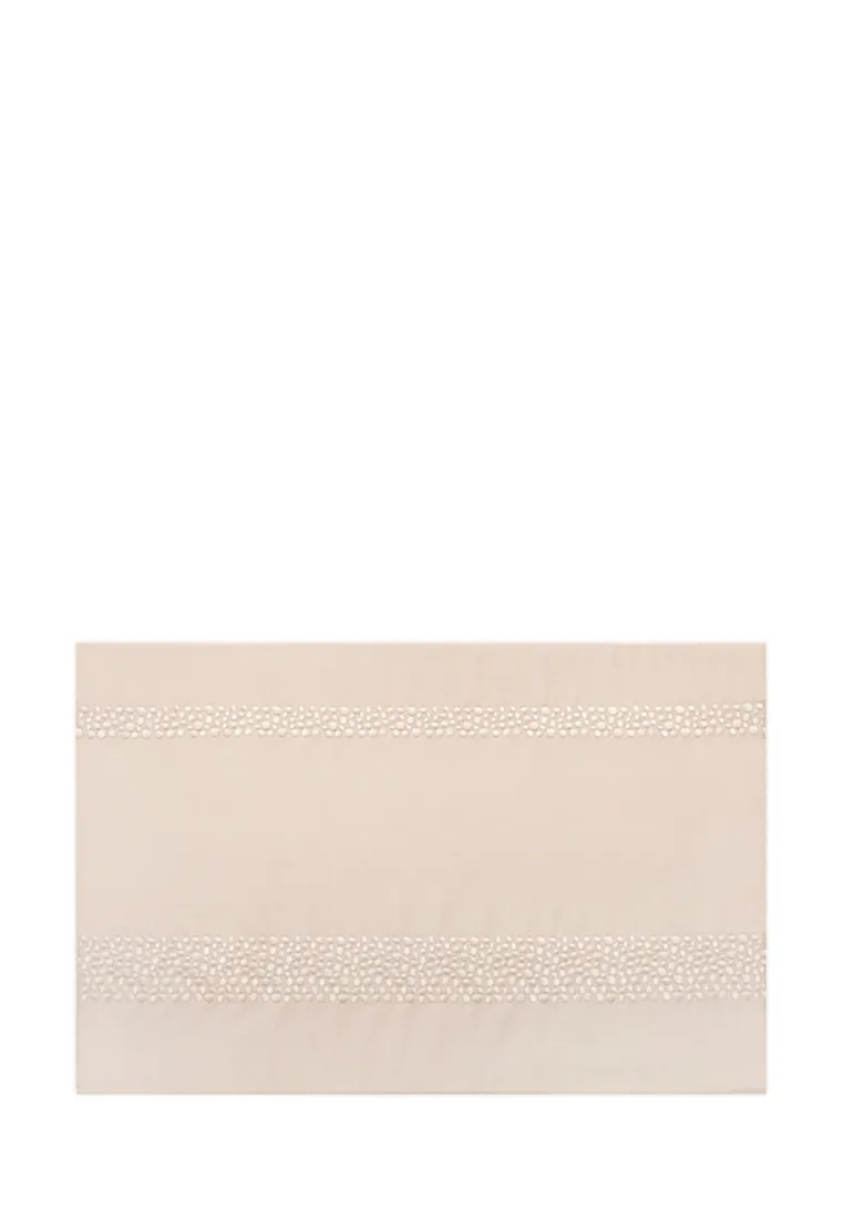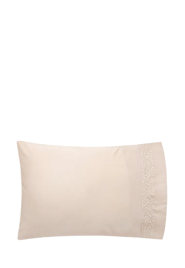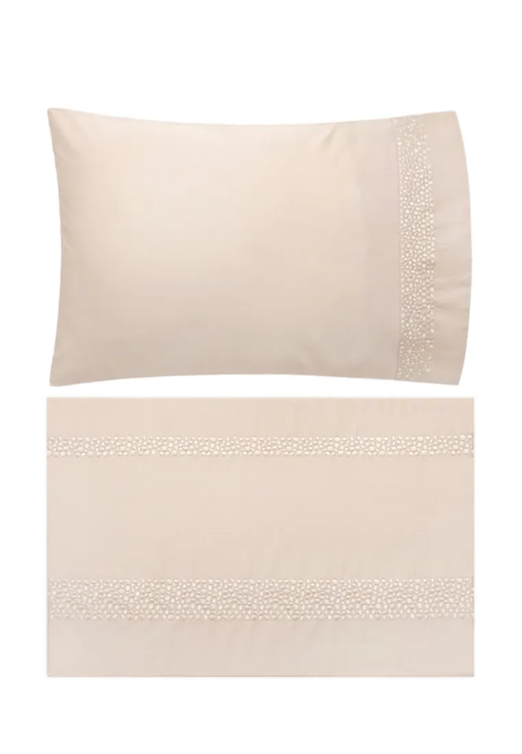 Постельное белье “CHIC” сшито из высококлассного сатина плотностью 300ТС. Ткань тонкая, прочная с легким блеском. На наволочке и пододеяльнике выполнена изящная вышивка в виде россыпи перламутровых камушков. Простыня прямая, пододеяльник застегивается на 5 пуговиц.