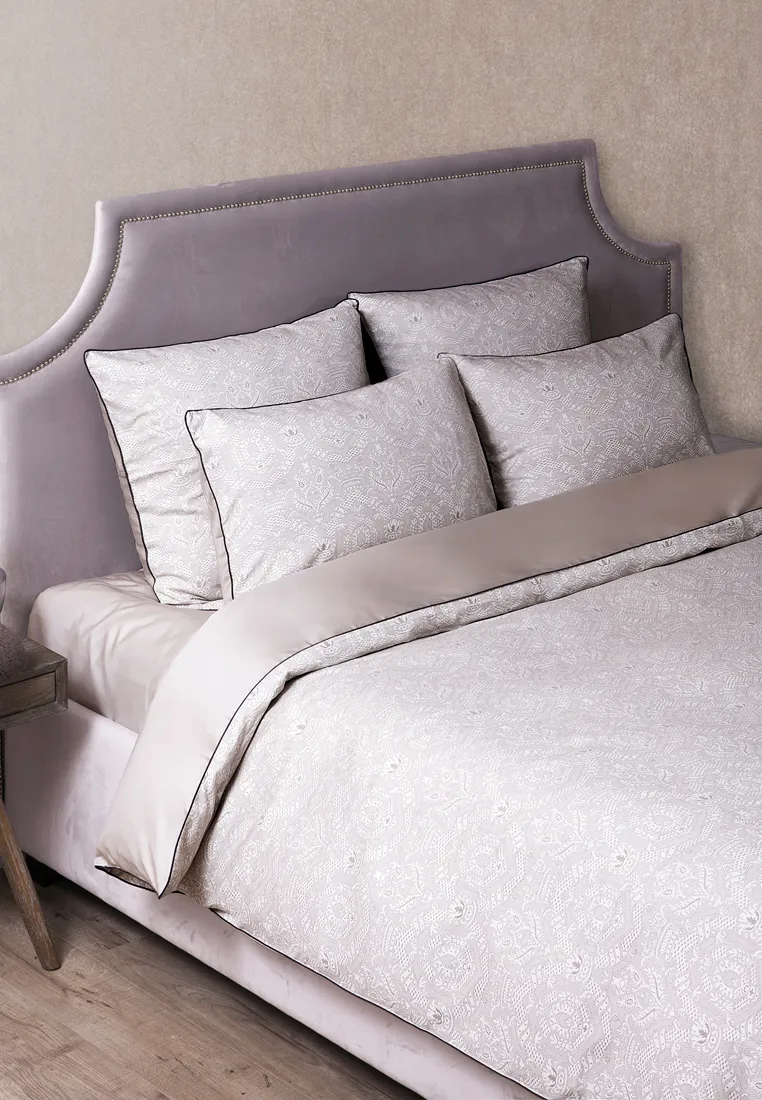 КПБ"MEDALION"- это сатин-жаккард,100% хлопок,300ТС.Сатин-жаккард имеет сложное плетение,которое дает плотную,изностостойкую,гладкую до блеска ткань,с красивым рельефным барочным рисунком. Цвет серо-бежевый, изнанка пододеяльника гдадкокрашенный сатин, пододеяльник и наволочки с кантом шоколадного цвета Пододеяльник на пуговицах.Стирается при 40С.