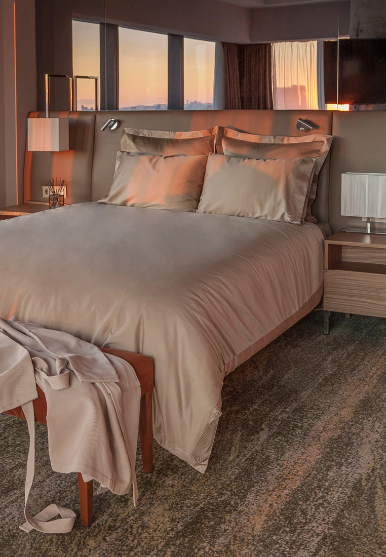 Роскошный комплект “SAVOY” в бронзовом цвете создан для тех, кто ценит классику с изюминкой. Постельное белье из сатина, плотностью 300ТС: прочное, и, в то же время, нежное и шелковистое. В отличие от шелка, не скользит и практически не мнется. Наволочки, пододеяльник и конверт из ткани, в который упакован комплект, декорированы геометрической вышивкой.Тип ткани - хлопок 100%, сатин.
