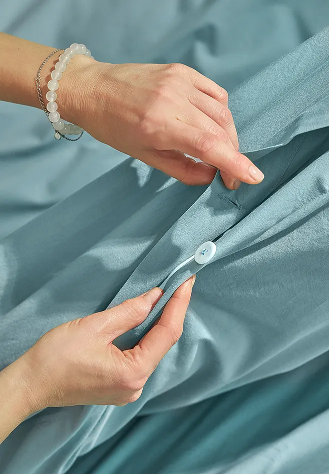 На наволочках и пододеяльнике двойная строчка, типа джинсовой. Пододеяльник на пуговицах.