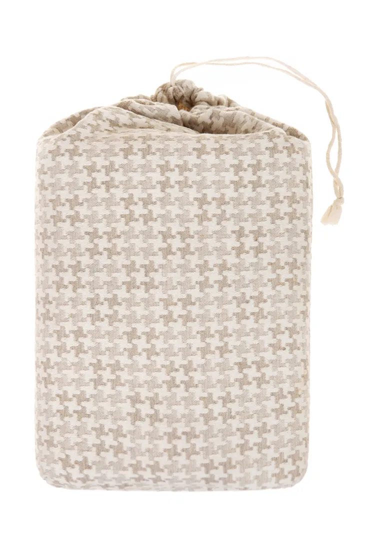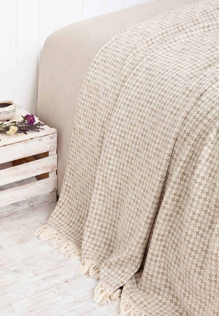 Покрывало "EASY LIFE" выполнено из хлопка и льна жаккардовым переплетением и упаковано в мешочек из этой же ткани. Край покрывала отделан густой бахромой. Отличительная черта жаккарда - тканый, регулярно повторяющийся рисунок. Рисунок покрывала "EASY LIFE" - изысканная "пепита" (гленчек).Изделия из жаккарда прочные, износостойкие, поскольку нити при изготовлении покрывала при переплетении еще и перекручиваются. Жаккардовое покрывало "EASY LIFE" устойчиво к деформации, не вытягивается и непритязательно в уходе.