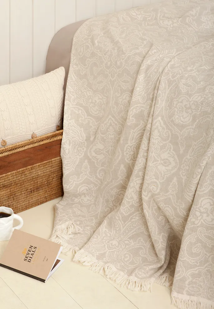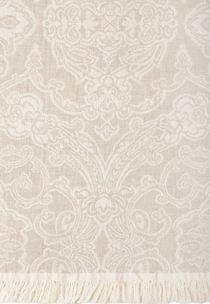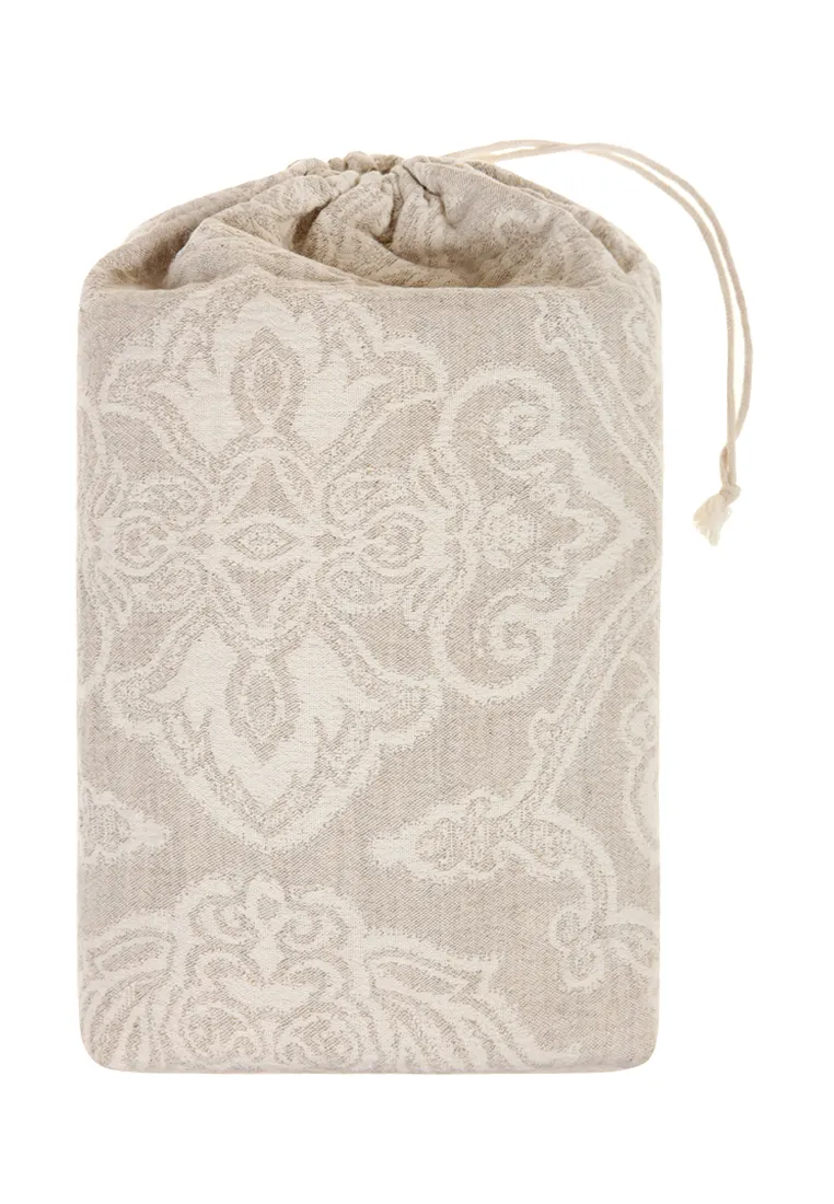 Покрывало "Everytime" выполнено из хлопка с примесью льна (17%). Ткань натуральная, гипоаллергенная и очень приятная на ощупь. Цвет природный: экрю и оттенок некрашеного льна. Жаккардовое переплетение нитей образует причудливые узоры и вензеля. Край покрывала отделан густой бахромой.Изделия из жаккарда прочные, износостойкие, поскольку нити при изготовлении покрывала при переплетении еще и перекручиваются. Жаккардовое покрывало "Everytime" устойчиво к деформации, не вытягивается и непритязательно в уходе. Упаковано в стильный мешочек из такой же ткани. Отличная идея подарка в оригинальной упаковке!