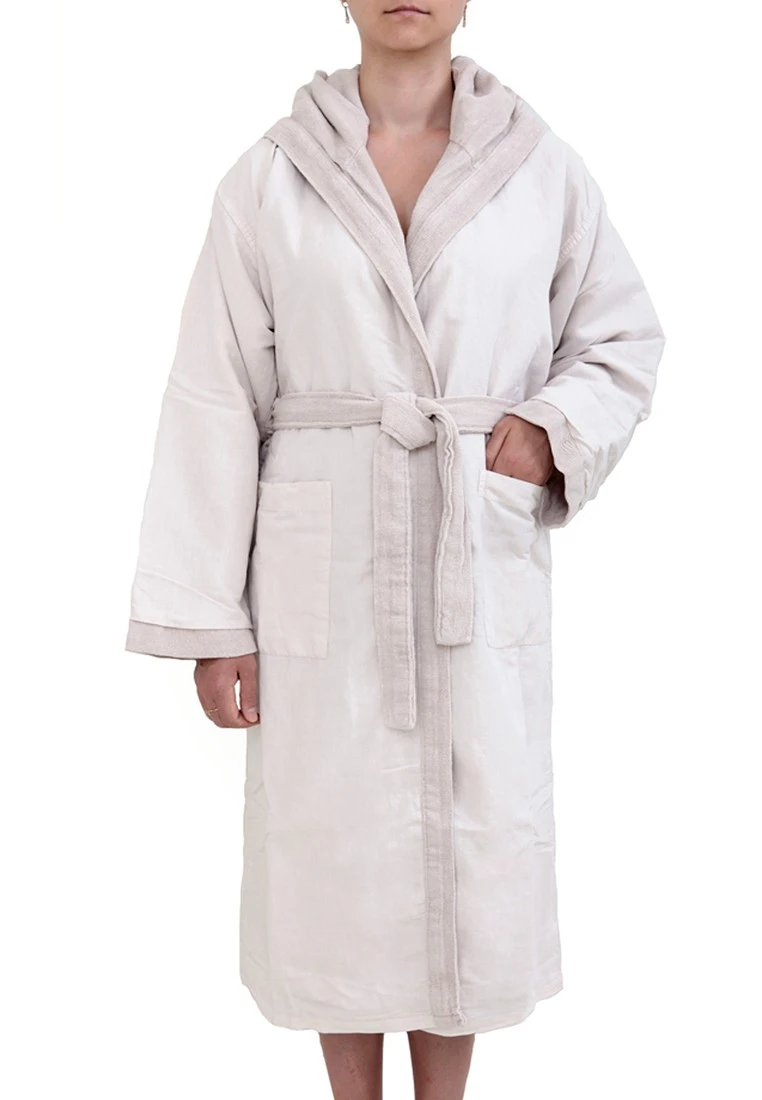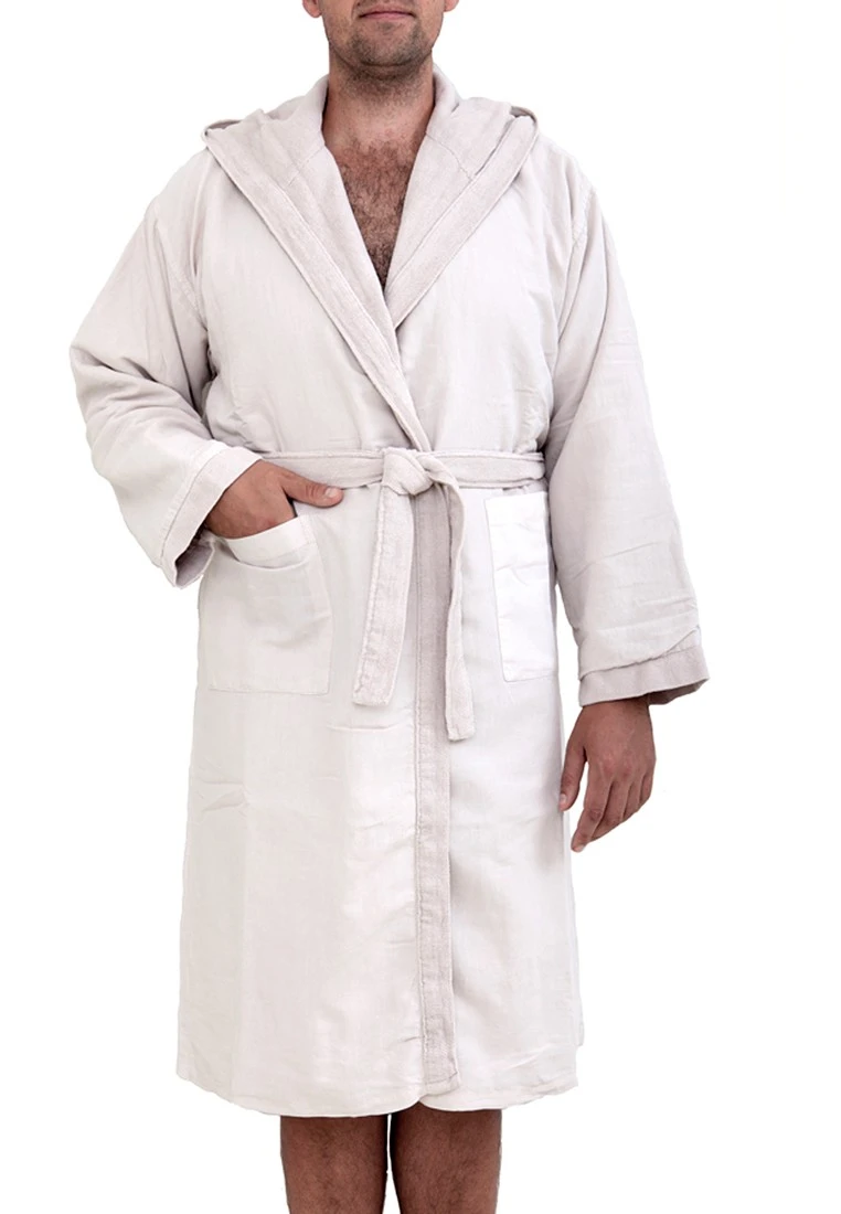 Халат “SENSES” сшит из махрового полотна, которое предварительно декатировано (обработано паром) для окончательной усадки ткани. Покупая этот халат, Вы можете быть уверены, что он не станет Вам мал после первой стирки.Благодаря специальной технологии производства, халат плотный, но в то же время мягкий и нежный. Он хорошо впитывает влагу, быстро сохнет и легко гладится. Состав изделия полностью натуральный (лен и хлопок), ткань хорошо пропускает воздух, позволяя телу дышать. В нем будет комфортно в любое время года.