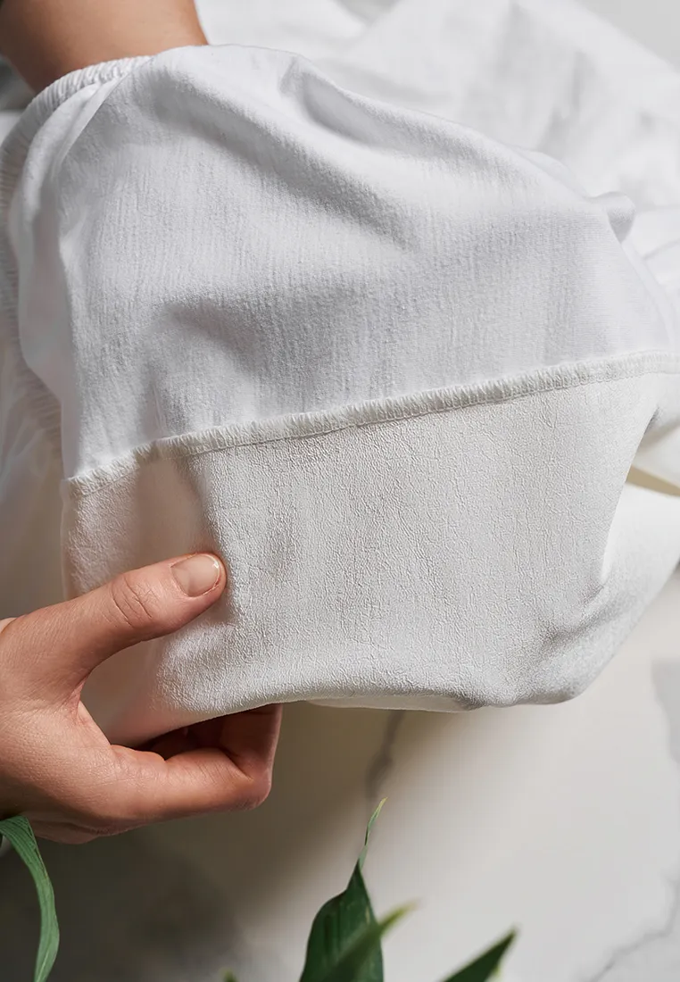 Наматрасник двухслойный. Верх – белое трикотажное полотно, низ – полиуретан, который выполняет защитную функцию. Имеет резинку по всей длине и надевается на матрас как трикотажная простыня, поэтому плотно примыкает к матрасу и не скользит. Наматрасник защищает матрас от пятен, смягчает и выравнивает его поверхность, так чтобы спать было комфортно.