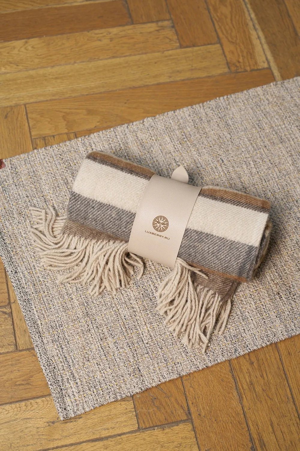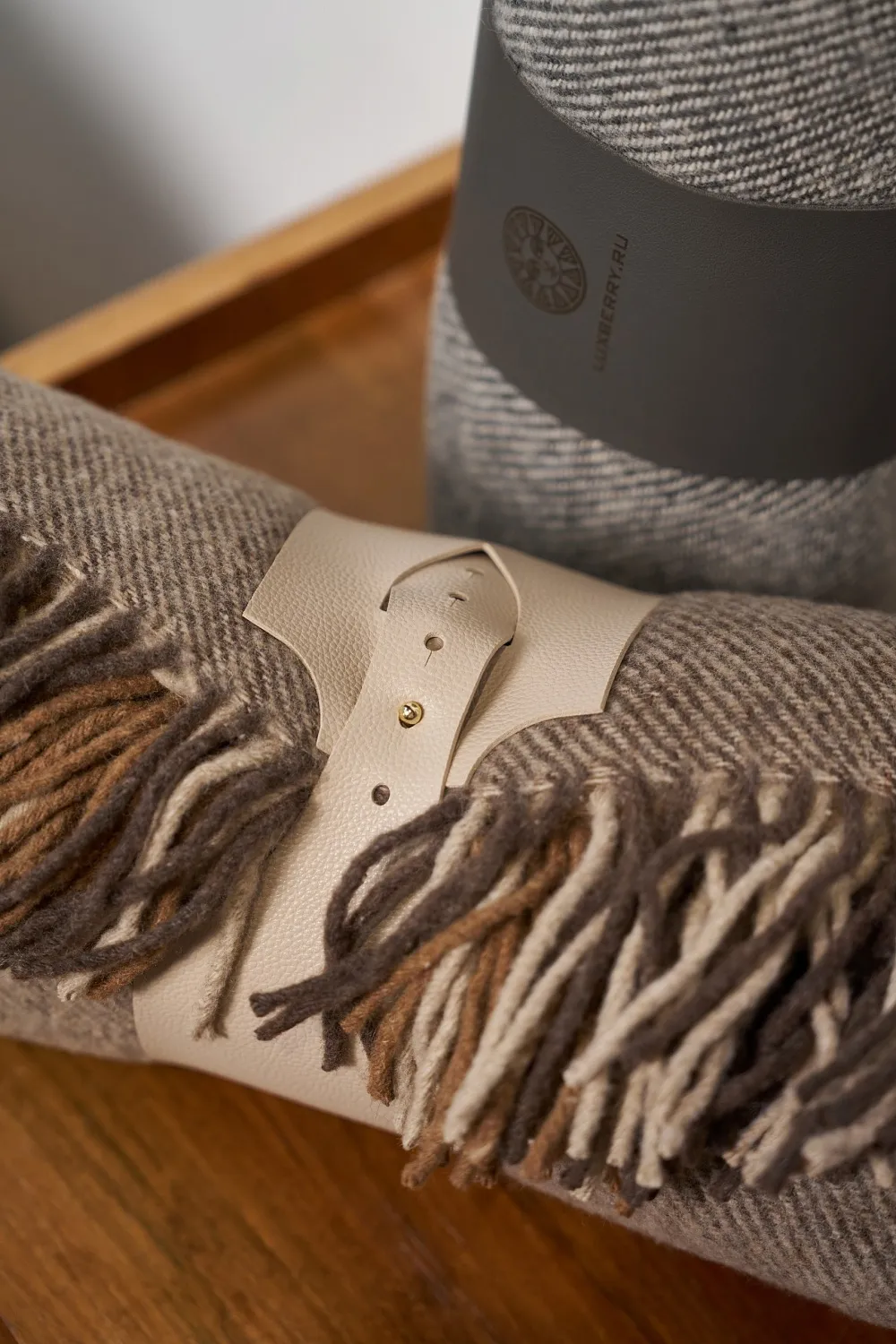 Плед перевязан брендированным ремешком из эко- кожи бежевого цвета, компактно, а значит удобно для переноски или хранения и стильно для подарка!