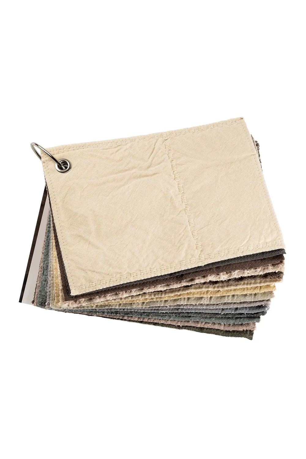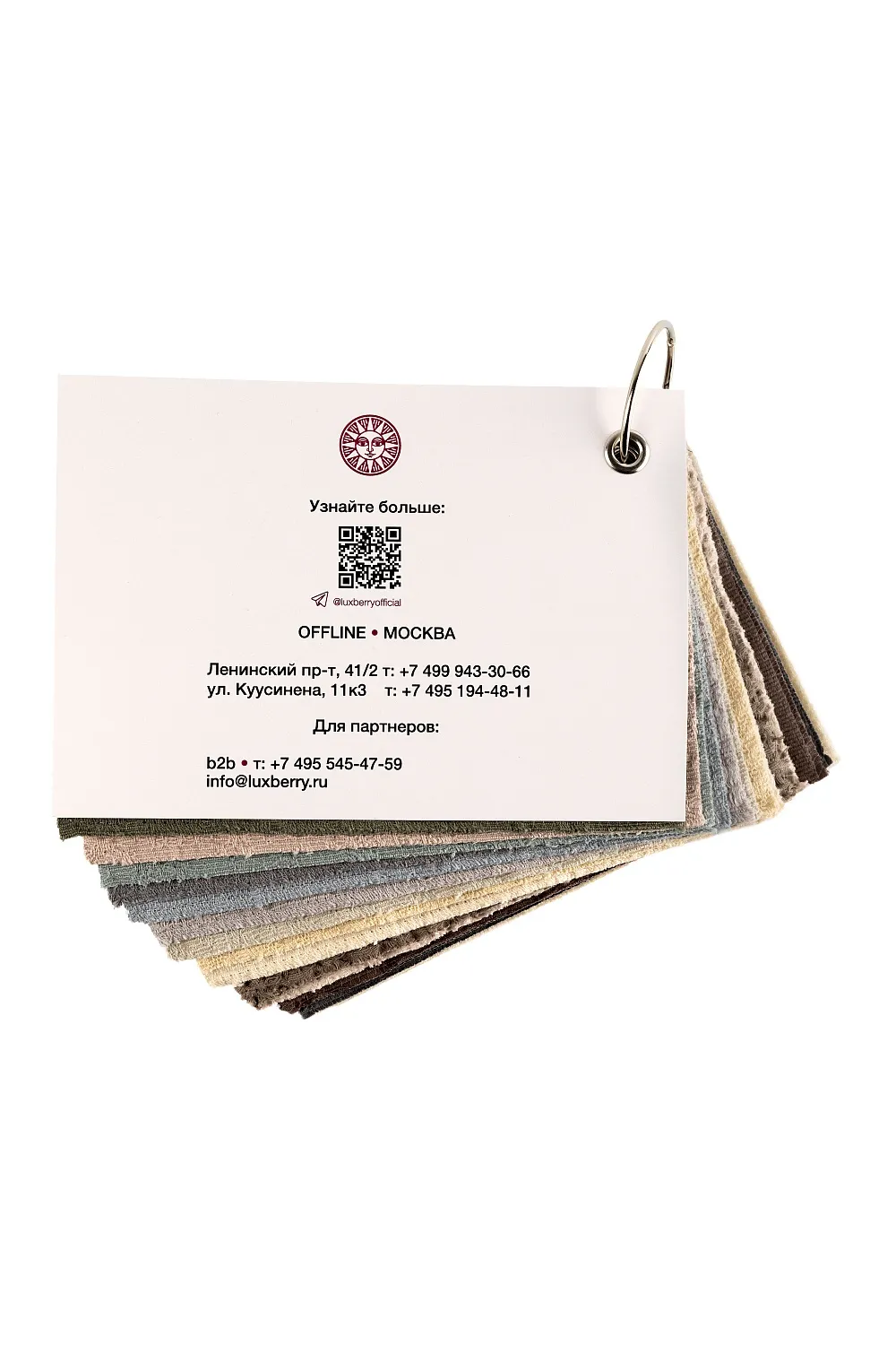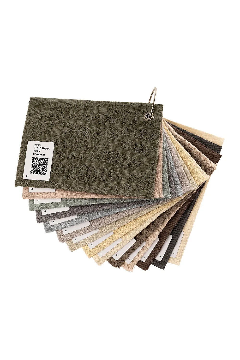 KUBU в трех цветах, BOUCLE в двух цветах, SIMPLE STRIPS, SOLAR, ZIGGY, RAINY DAY, JAPANDY морской туман; MOON BEAN серый люрекс, MOSS в двух цветах, TREE BARK. На оборотней стороне каждого покрывала прочно приклеен стикер с названием и цветом этого покрывала и куар кодом, который ведет в карточку это покрывала на сайте, где вы сможете найти всю информацию о нем, включая наличие, размеры и цены.