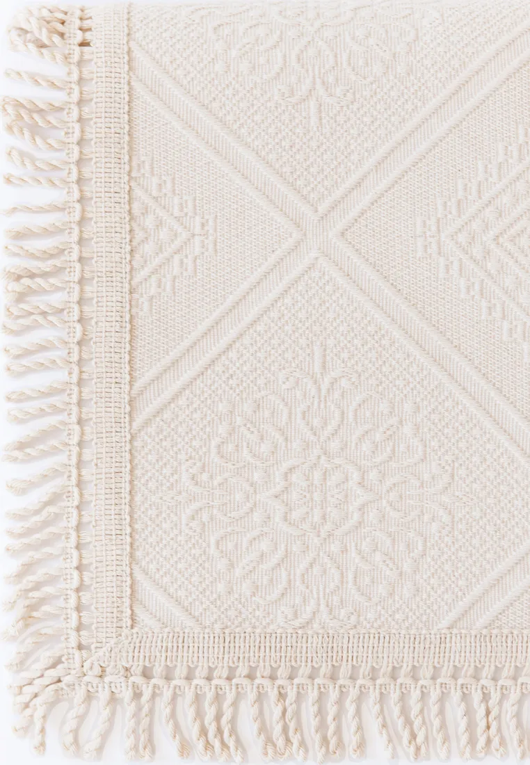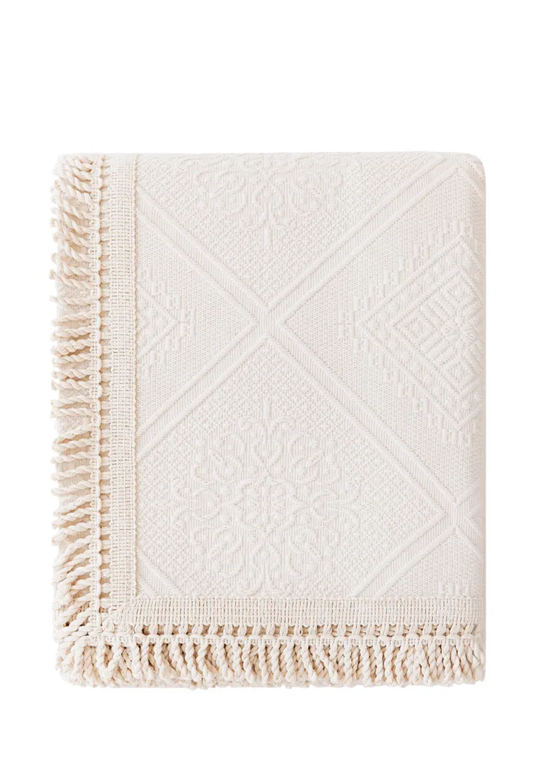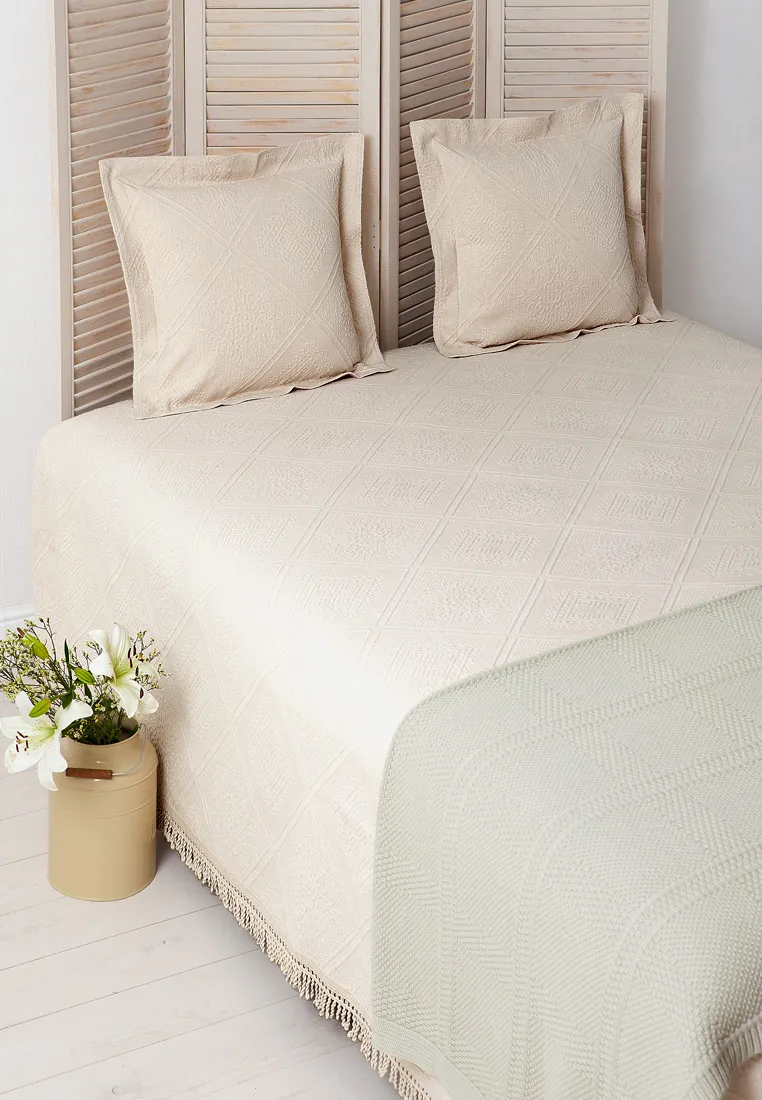 Плотное, но в то же время нежное покрывало "ALICE" из 100% хлопка станет достойным украшением Вашей спальни. Нежного цвета экрю, с рельефным узором (ромбы, орнамент, растительные элементы), декорировано бахромой по периметру. Покрывало прочное, хорошо держит форму. При правильном уходе, прослужит Вам долго, не теряя потребительские свойства.Рекомендуем дополнить покрывало наволочками из этой коллекции.