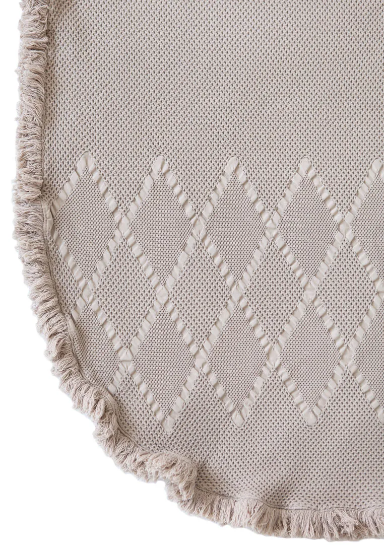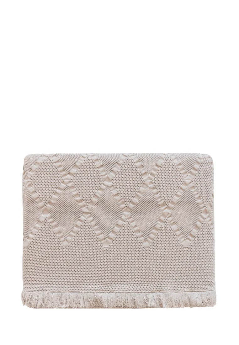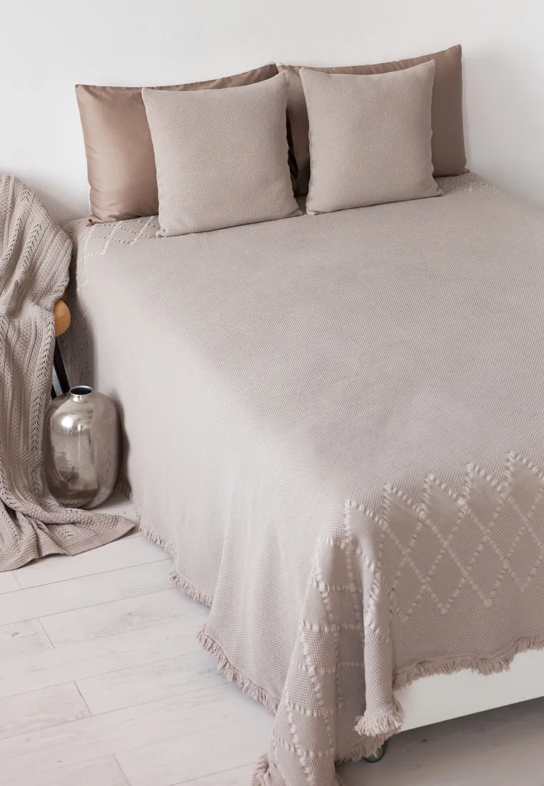 Покрывало "GRASS" выполнено из 100% хлопка. Ткань натуральная, гипоаллергенная и очень приятная на ощупь. Покрывало довольно легкое, при этом плотное и устойчивое к деформации. Дизайн: основа без рисунка, декор - ромбы по краям (сверху и снизу) и бахрома по периметру. Его также можно использовать в качестве простыни для укрывания. В коллекции 2 цвета - бежевый и лаванда.Тип ткани - хлопок 100%.