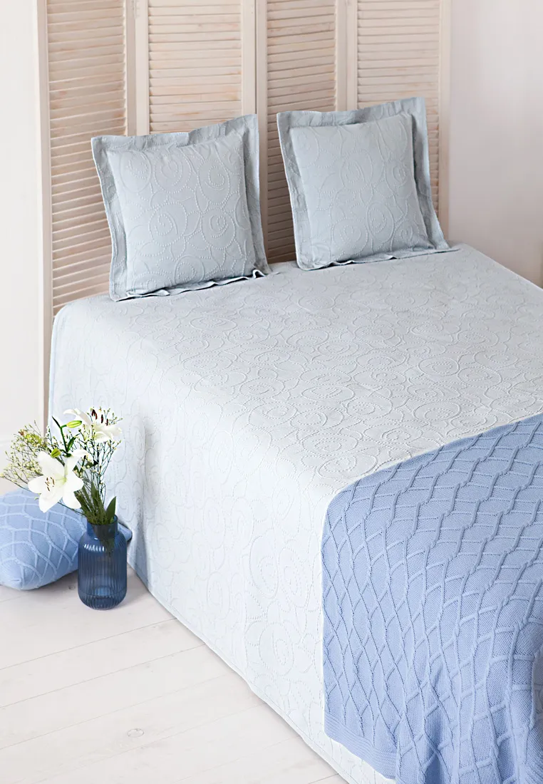 Покрывало "JANE" выполнено из 100% натуральной хлопковой ткани, декорировано фактурным жаккардовым цветочным узором. Благодаря натуральному составу, покрывало "дышит", не вызывает аллергии, создает ощущение уюта. В коллекции 3 цвета: голубой, лавандовый, экрю.Рекомендуем дополнить покрывало декоративными наволочками из этой коллекции.