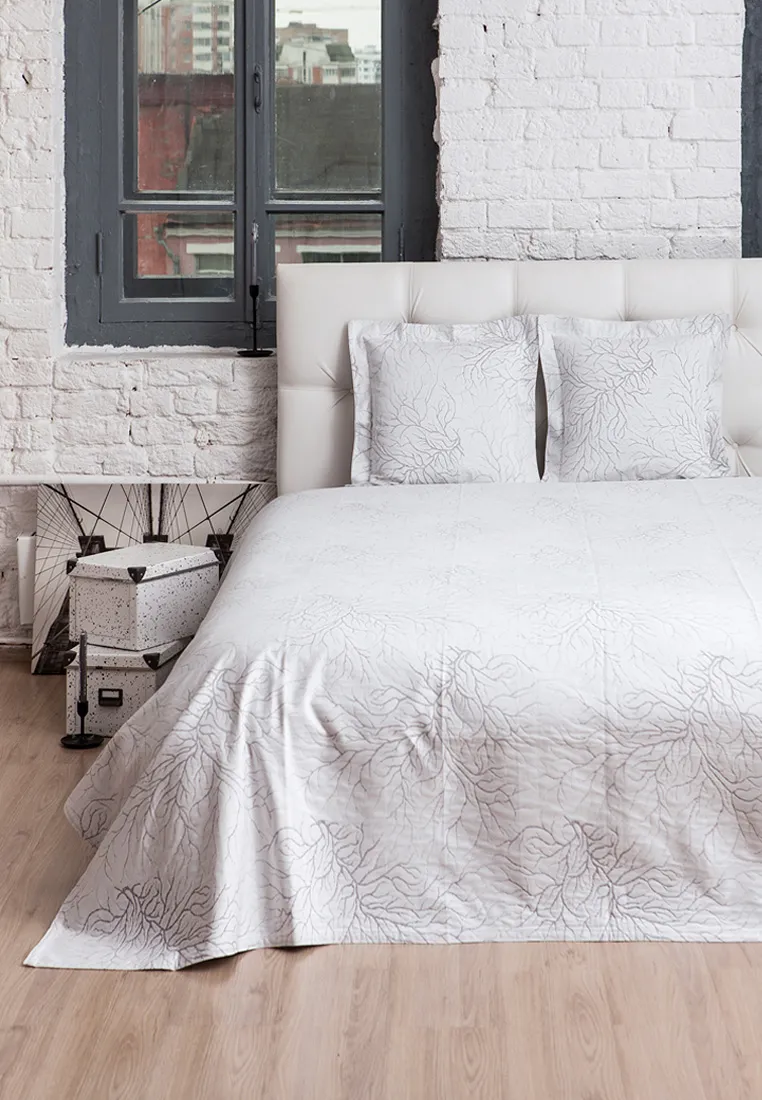 "CORAL" - прочное жаккардовое покрывало (натуральный состав). Рисунок - тонкие изящные веточки на белом фоне, узор рельефный, края прострочены двумя параллельными строчками.Покрывало выглядит нежно, подойдет для гостиной, так и для спальни, особенно хорошо будет смотреться с белой мебелью. В сочетании с декоративными наволочками из этой коллекции образует нарядный комплект, который будет гармонично и аккуратно смотреться в любом интерьере.