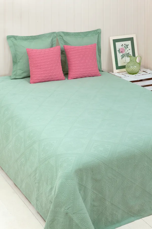 Плотное тканое покрывало “LANA” зеленого цвета станет изящным штрихом в Вашей спальне. Нежное и, одновременно, практичное - оно никогда не выйдет из моды. Рисунок в стиле кантри смотрится оригинально и стильно. Узор неброский, поэтому покрывало будет хорошо сочетаться с другими предметами интерьера, не перегружая пространство.Купить покрывало можно отдельно или в комплекте с наволочками из коллекции “LANA”.