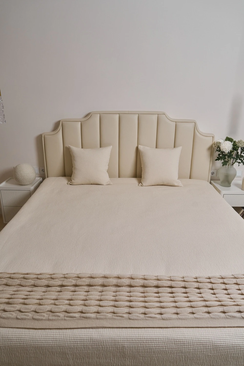 Чтобы ваша кровать выглядела как на фото в журнале, добавьте декоративные подушки из той же коллекции и уютный вязаный хлопковый плед. Полный ансамбль для сладких снов и стильных фото!