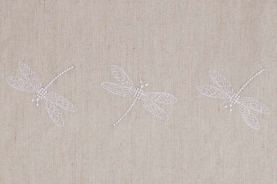Изысканные шторы “GARDEN” из смесовой ткани (лен с хлопком) декорированы вертикальными полосками машинной мережки и укомплектованы широким подхватом, украшенным вышитыми изящными стрекозами.