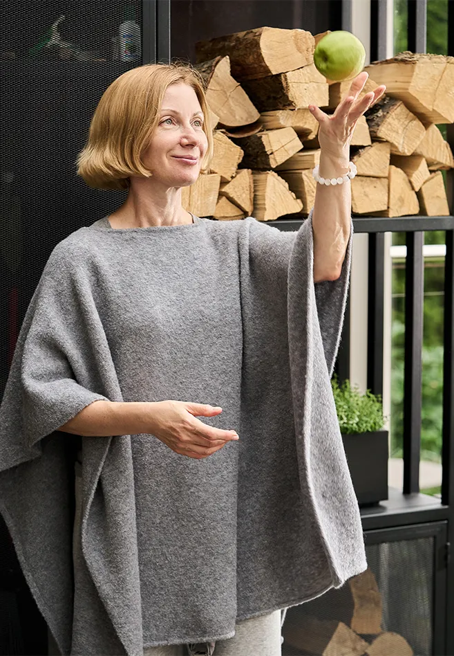 Вы себя будете прекрасно чувствовать в нем на прогулке в парке, на террасе или даже дома, когда хочется закутаться во что-то очень мягкое и уютное.