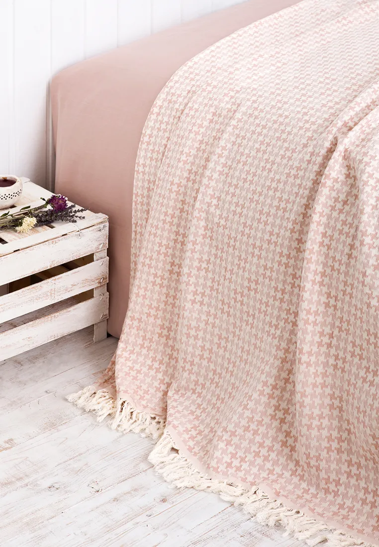 Покрывало "EASY LIFE" выполнено из хлопка и льна жаккардовым переплетением и упаковано в мешочек из этой же ткани. Край покрывала отделан густой бахромой. Отличительная черта жаккарда - тканый, регулярно повторяющийся рисунок. Рисунок покрывала "EASY LIFE" - изысканная "пепита" (гленчек).Изделия из жаккарда прочные, износостойкие, поскольку нити при изготовлении покрывала при переплетении еще и перекручиваются. Жаккардовое покрывало "EASY LIFE" устойчиво к деформации, не вытягивается и непритязательно в уходе.
