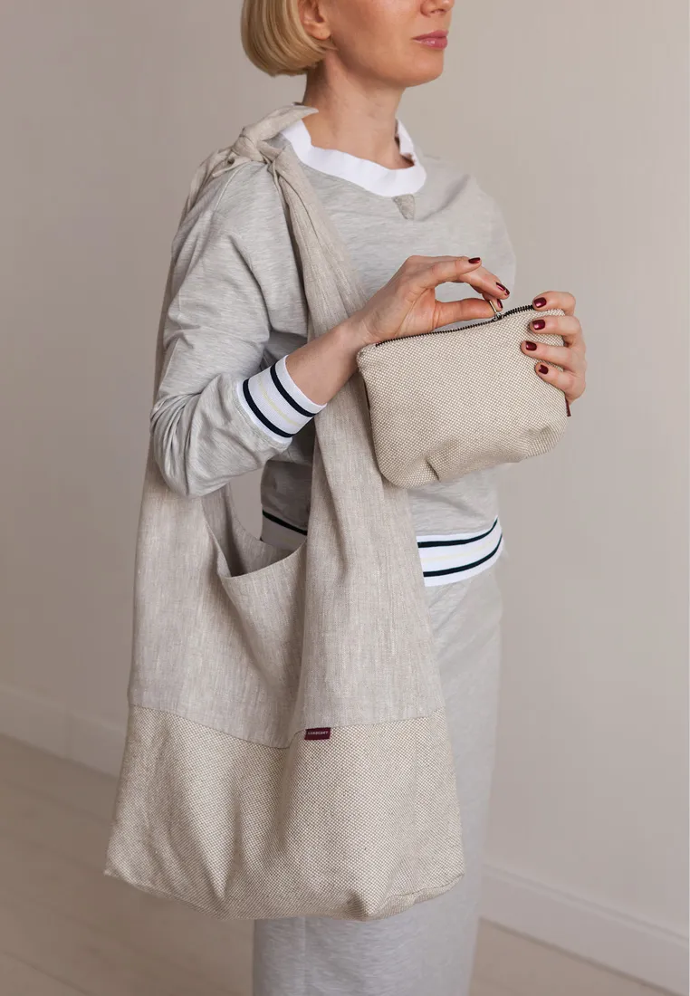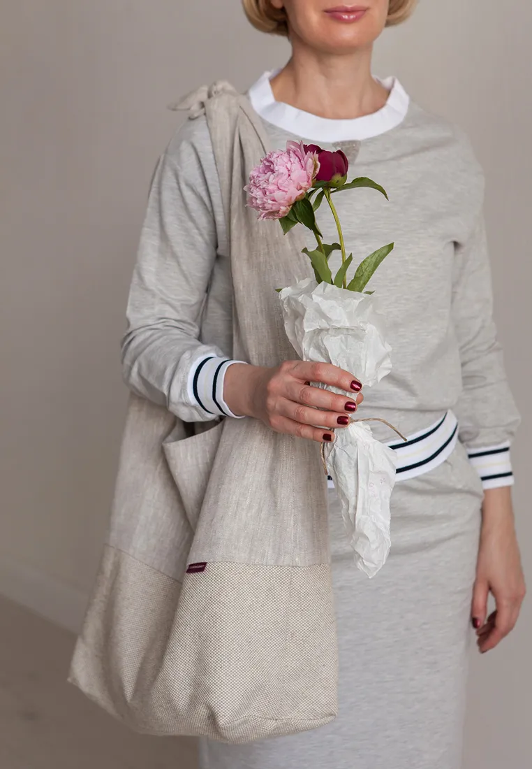 Универсальная сумка для города и отдыха. Отлично подойдет для прогулки, поездки на пляж, может использоваться как шоппер для похода за покупками. Дно плотное, сумка хорошо держит форму. Внутри вместительный удобный карман. Аккуратный дизайн сумки впишется в любой образ.Сшита из двух тканей: нижняя часть: плотная ткань 50\50 лён и хлопок, верхняя часть – 100% лён. Размер: высота (длина ручки до дна сумки) – 68 см, дно – 35*17 см.