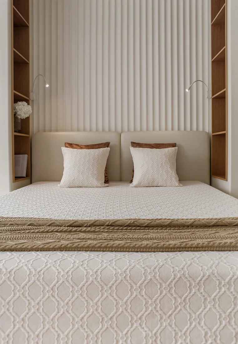 Покрывало выполнено в классическом стиле с интересным дизайном в виде ромбиков.