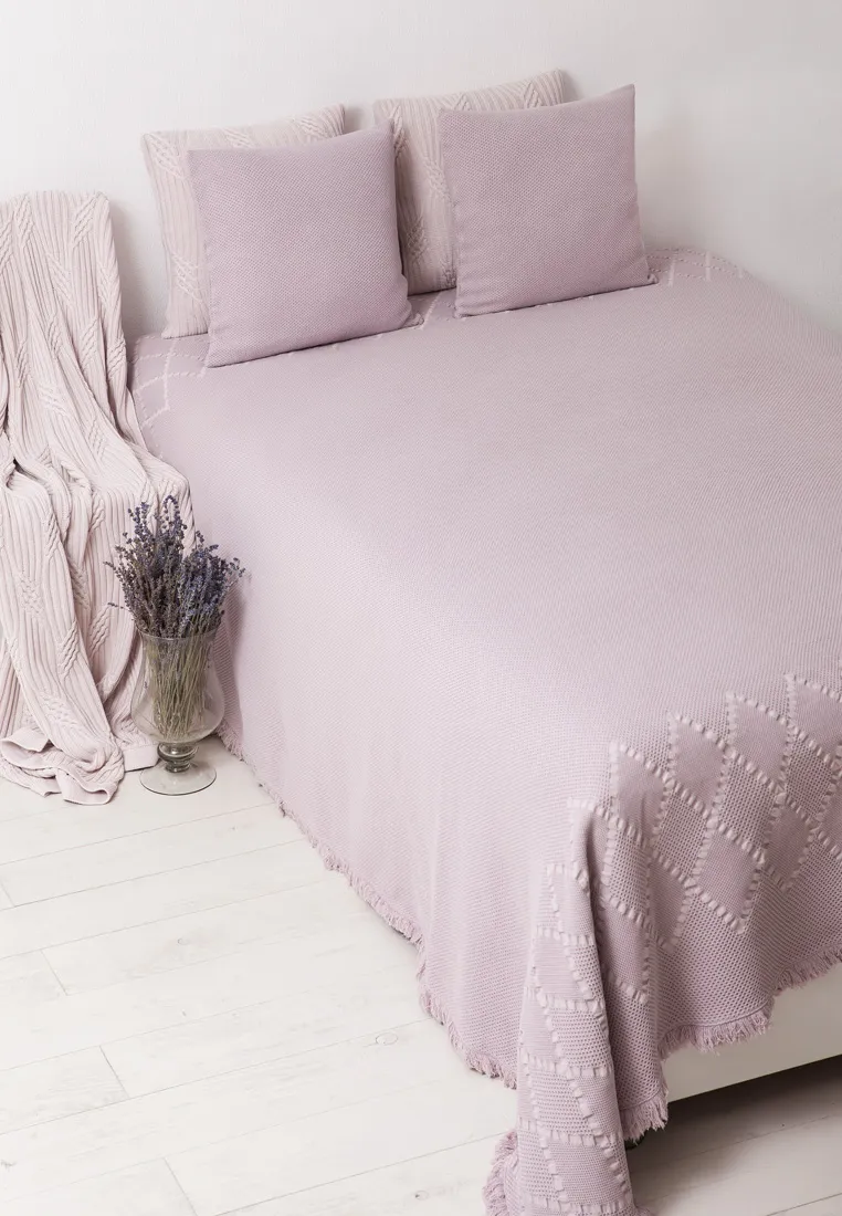 Покрывало "GRASS" выполнено из 100% хлопка. Ткань натуральная, гипоаллергенная и очень приятная на ощупь. Покрывало довольно легкое, при этом плотное и устойчивое к деформации. Дизайн: основа без рисунка, декор - ромбы по краям (сверху и снизу) и бахрома по периметру. Его также можно использовать в качестве простыни для укрывания. В коллекции 2 цвета - лаванда и бежевый.Тип ткани - хлопок 100%.