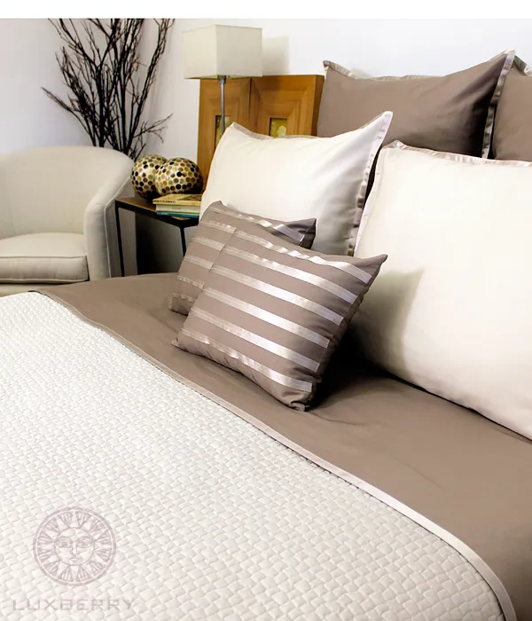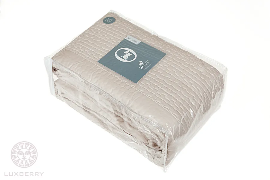 Стеганое покрывало “NEW SAND” выполнено из сатина нежного оттенка речного жемчуга. В зависимости от освещения оттенок меняется от теплого светло-бежевого до прохладного серо-бежевого. Покрывало простегано мелким кракелюром строчек. По периметру отделано гладким кантом шириной 5 см. Изнаночная сторона белая.