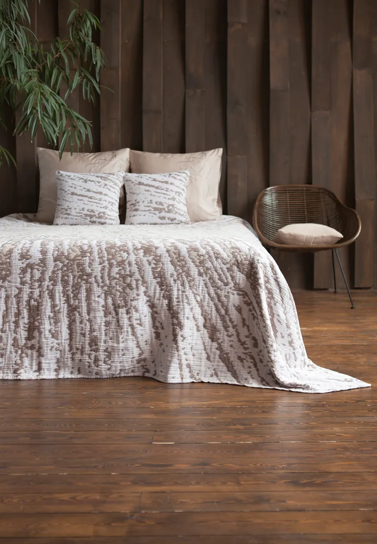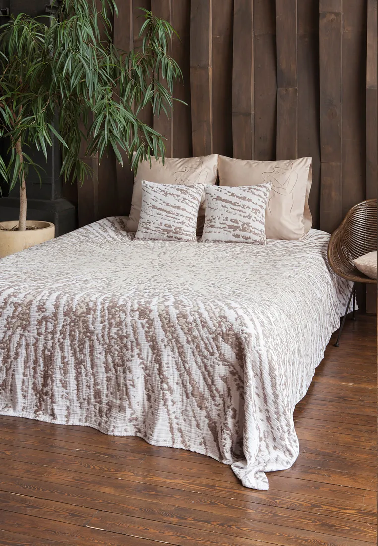 Покрывало "TIRAMISU" из 100% хлопка наверняка оценят любители необычных расцветок: узор на ткани напоминает брызги кофе на молоке. Оно будет хорошо смотреться в спальне, органично впишется в гостиную в бохо-стиле или в интерьер деревянного загородного дома, станет оригинальным и практичным подарком творческому человеку.Материал - жаккард: гладкий, хорошо сохраняет форму, достаточно прост в уходе. Стирайте это красивое покрывало в машинке (при температуре 30 градусов), и оно будет выглядеть как новое не один год.