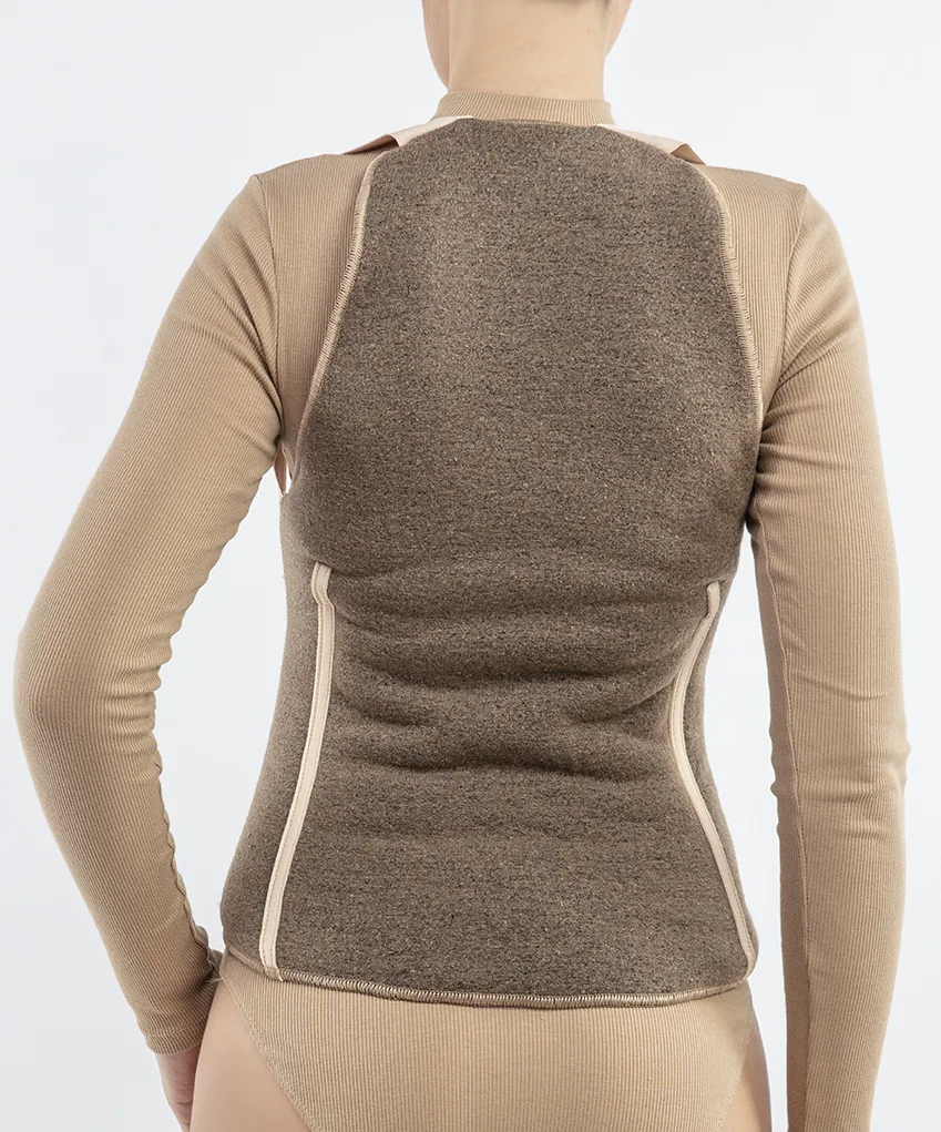 Пояс-корсет с легким компрессионным эффектом защищает от переохлаждения, сквозняков, мышечных травм при физическихнагрузках, показан при радикулите и остеохондрозе. Регулируется застежкой-липучкой на талии. Мягкие резинки на плечах препятствуют скольжению стрейчевого полотна на спине и образованию складок. Косточки, вставленные в боковые швы, помогают перераспределить нагрузку на позвоночник. Материал - трикотажное полотно с чистошерстяным ворсом.