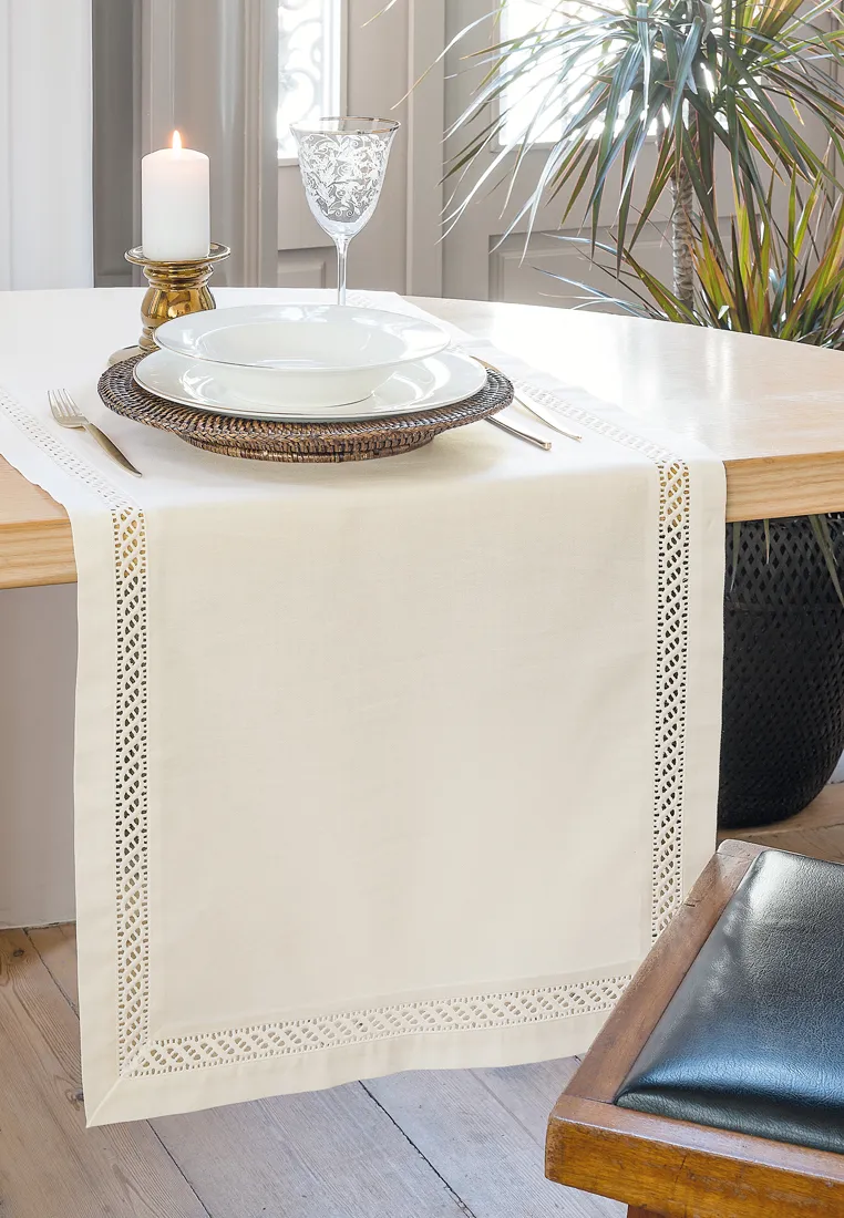 Дизайн - нестареющая классика, края обработаны каймой, которую декорирует изящная кружевная вставка. Дорожка преобразит стол и прослужит Вам долго.